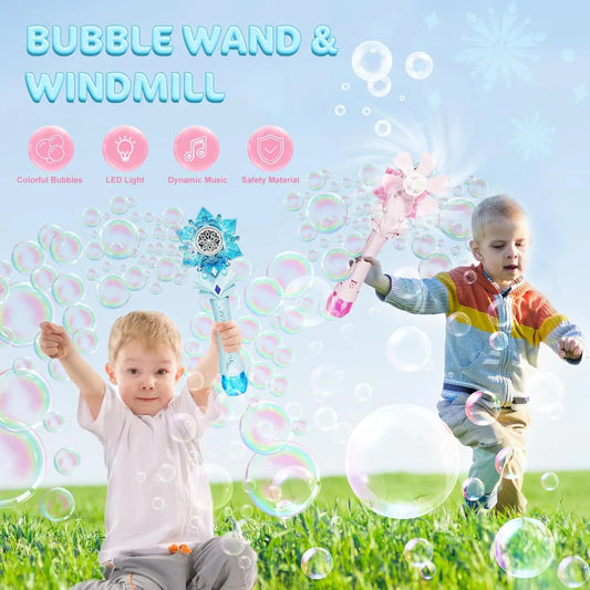 VATOS Bubble Wands X2 for Kids Auto Snowflake Bubble Blower Light & Music Bubble Machine with 2 Windmill Outdoor Toy Girls Boys